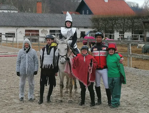 Christina Hufnagl und ihr Team vom Wiener Verein Equo Hoppers veranstalteten zum wiederholten Male das Online-Faschingsreiten. Die Reiterinnnen und Reiter absolvieren ihre Aufgaben im heimatlichen. Reitstall und werden dabei gefilmt. Die Videos werden anschließend online gestellt und von einem Richter bewertet. Als Basis für die Bewertung dienen die Regeln von Special Olympics. Am Samstag 15. Februar 2025 trafen sich vier Reiterinnen und Reiter von Pondera zum Video-Dreh.