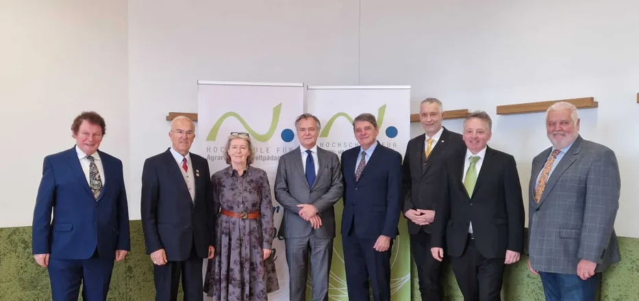 (vlnr): Richard Hinrichs (Präsident des Bundesverbandes für klassisch-barocke Reiterei Deutschland e.V.), Ludwig Hoffmann (Vizepräsident des Österreichischen Pferdesportverbands), Andrea Holzleithner (Präsidentin des Österreichischen Kuratorium für Therapeutisches Reiten), Nils Maydell (Vorsitzender des Direktoriums für Galopprennsport und Vollblutzucht in Österreich), Charles Trolliet (Präsident von Equiscope in der Schweiz), Thomas Haase (Rektor der Hochschule für Agrar- und Umweltpädagogik), Otto Kurt Knoll (Bundeskulturreferent des Österreichischen Pferdesportverbands), Dietrich Sifkovits (Präsident des Burgenländischen Pferdesportverbands). © Lisa Schildberger